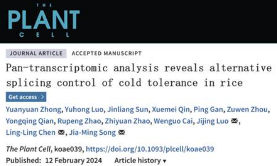 On February 12, 2024, team of Professor Chen Lingling and Luo Jijing from the College of Life Science and Technology of Guangxi University and professor Song Jiaming from Southwest University published a paper entitled “Pan-transcriptomic analysis reveals alternative splicing control of cold tolerance in rice” online in The Plant Cell. The paper generates the pan-transcriptome to characterize the transcriptional regulatory landscape of rice in response to cold stress, and the domestication selection of shear factors was involved in the ecological adaptation evolution of crops.