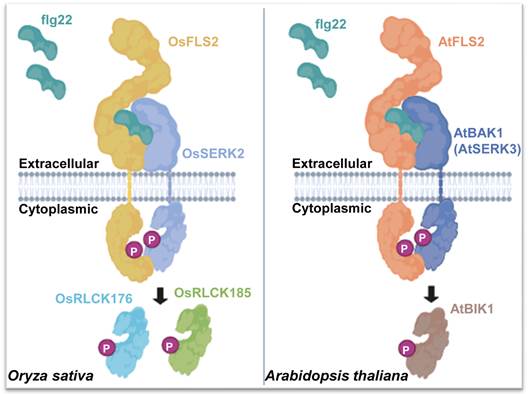 该研究阐明了水稻中flg22免疫通路的信号传导机制。细菌鞭毛多肽flg22诱导受体OsFLS2与共受体OsSERK2形成信号复合体,OsSERK2得以磷酸化激活OsFLS2。而OsFLS2又能磷酸化OsSERK2,导致OsSERK2的完全活化并促进OsSERK2对下游激酶OsRLCK176和OsRLCK185的快速磷酸化。研究人员通过质谱实验,确定了OsSERK2激活环上关键的自磷酸化位点以及OsFLS2介导的转磷酸化位点。