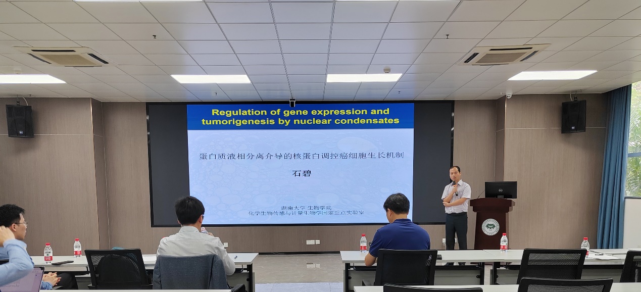 湖南大学石碧教授作“蛋白质液相分离介导的核蛋白调控癌细胞生长机制”的学术报告。报告包括4个内容:1.介绍蛋白质液相分离;2.核蛋白AKAP95调控RNA可变剪接和肿瘤生成;3.UUTX 通过相分离这一生物物理属性凝聚MLL4和P300来实现对增强子处的表观遗传修饰(H3K4Me,H3K27Ac)以及染色质三维结构的改变,从而调控基因表达,发挥其抑癌和维持正常发育的作用;4.蛋白质液相分离的研究现状。