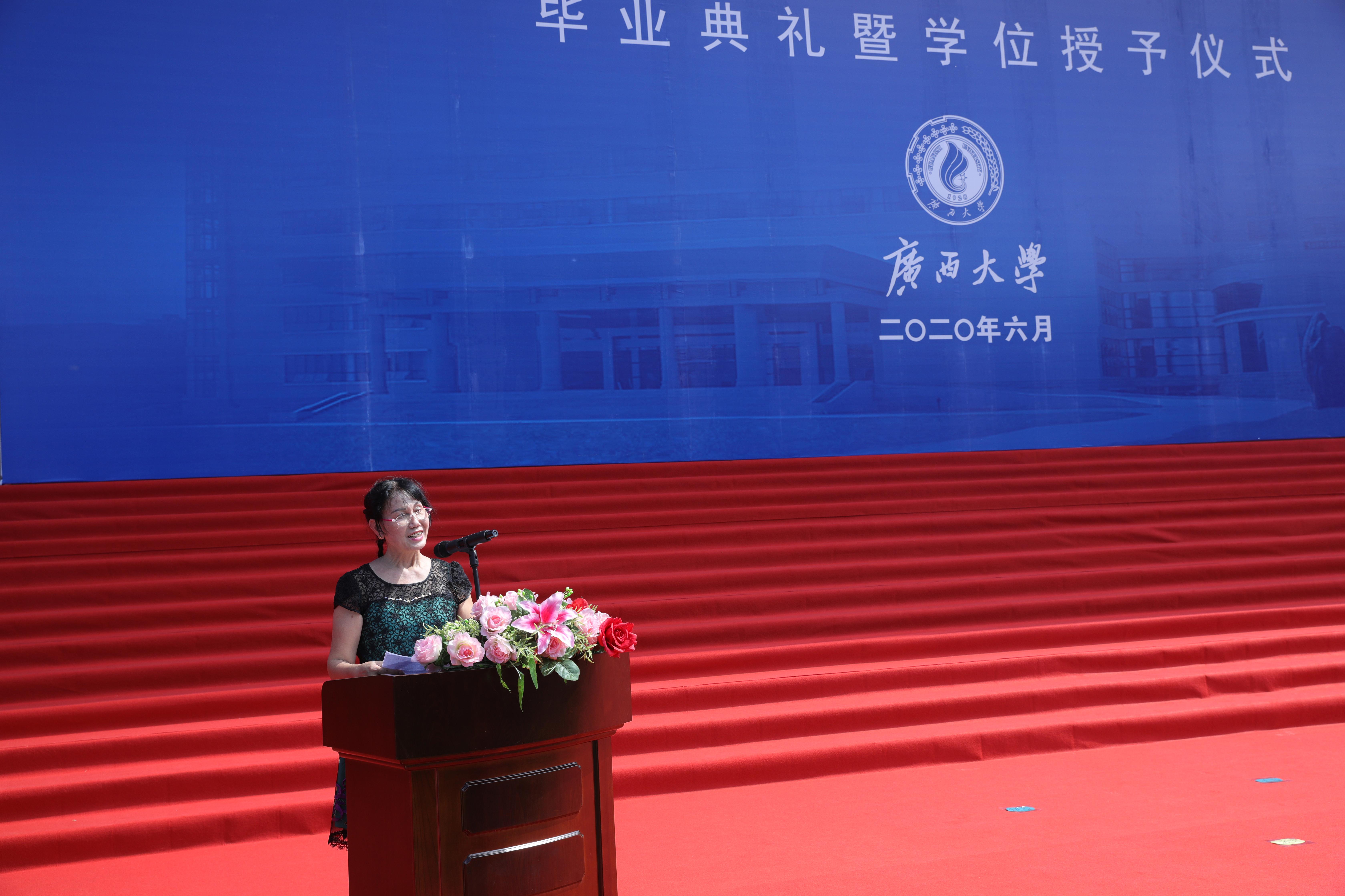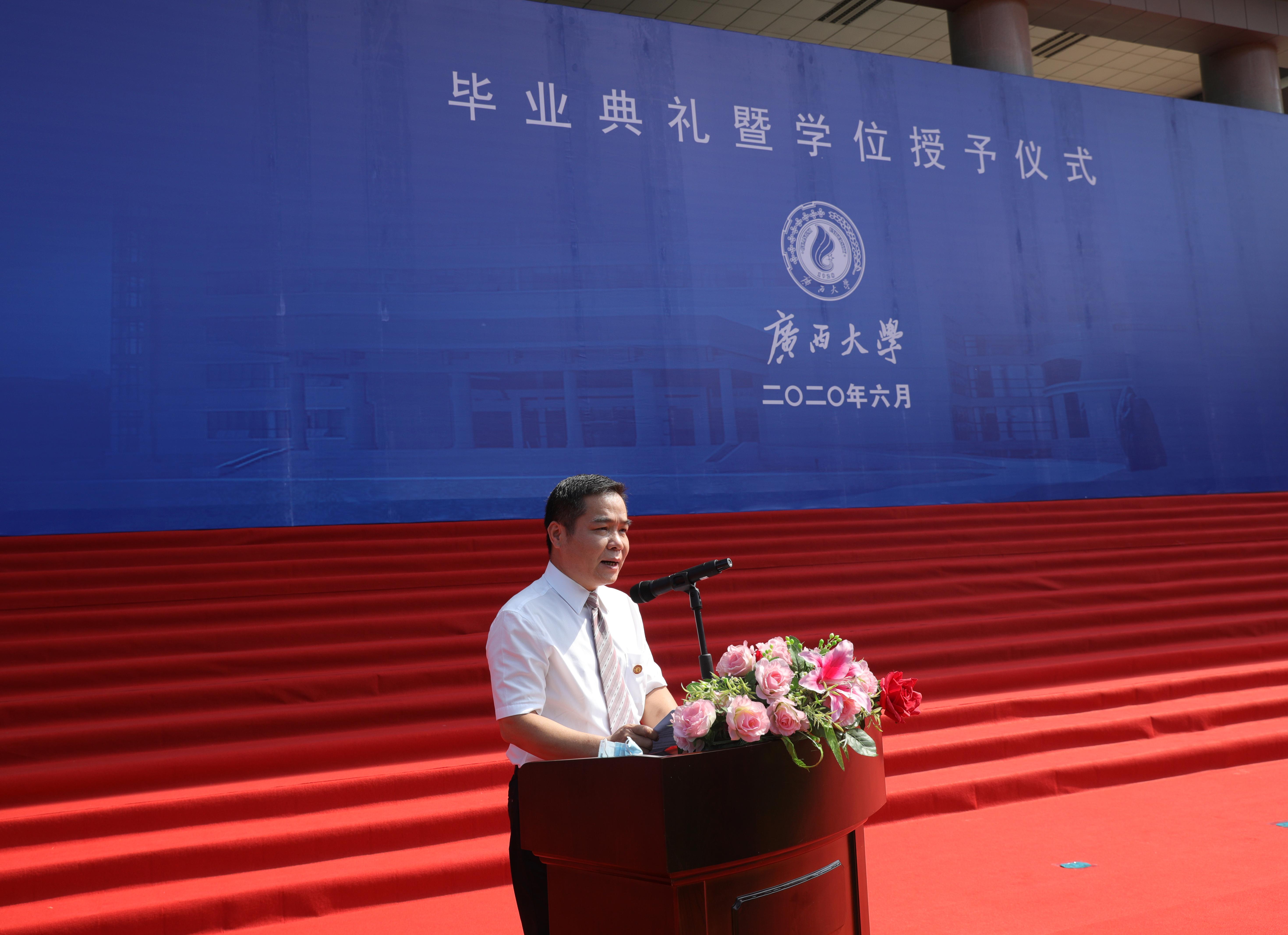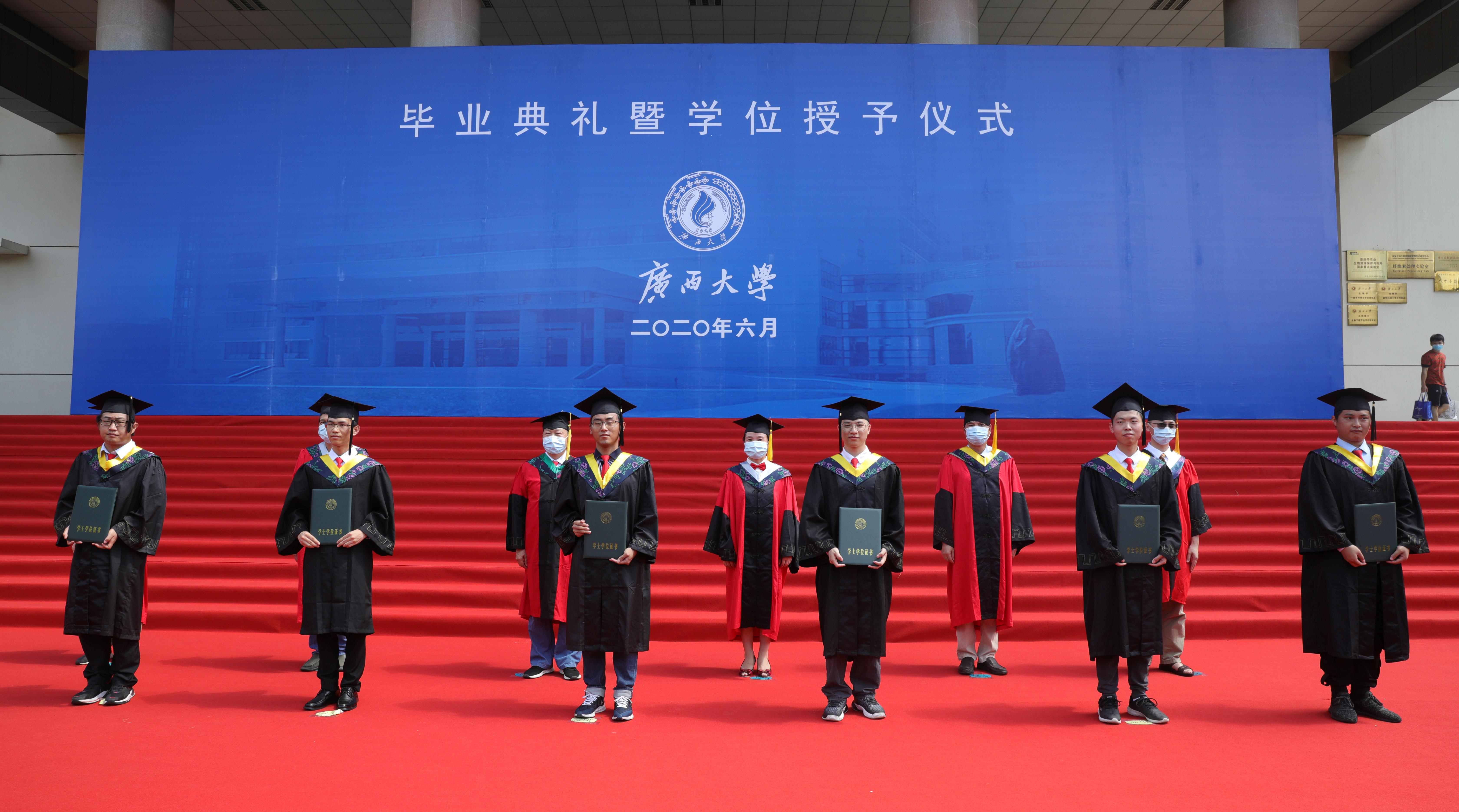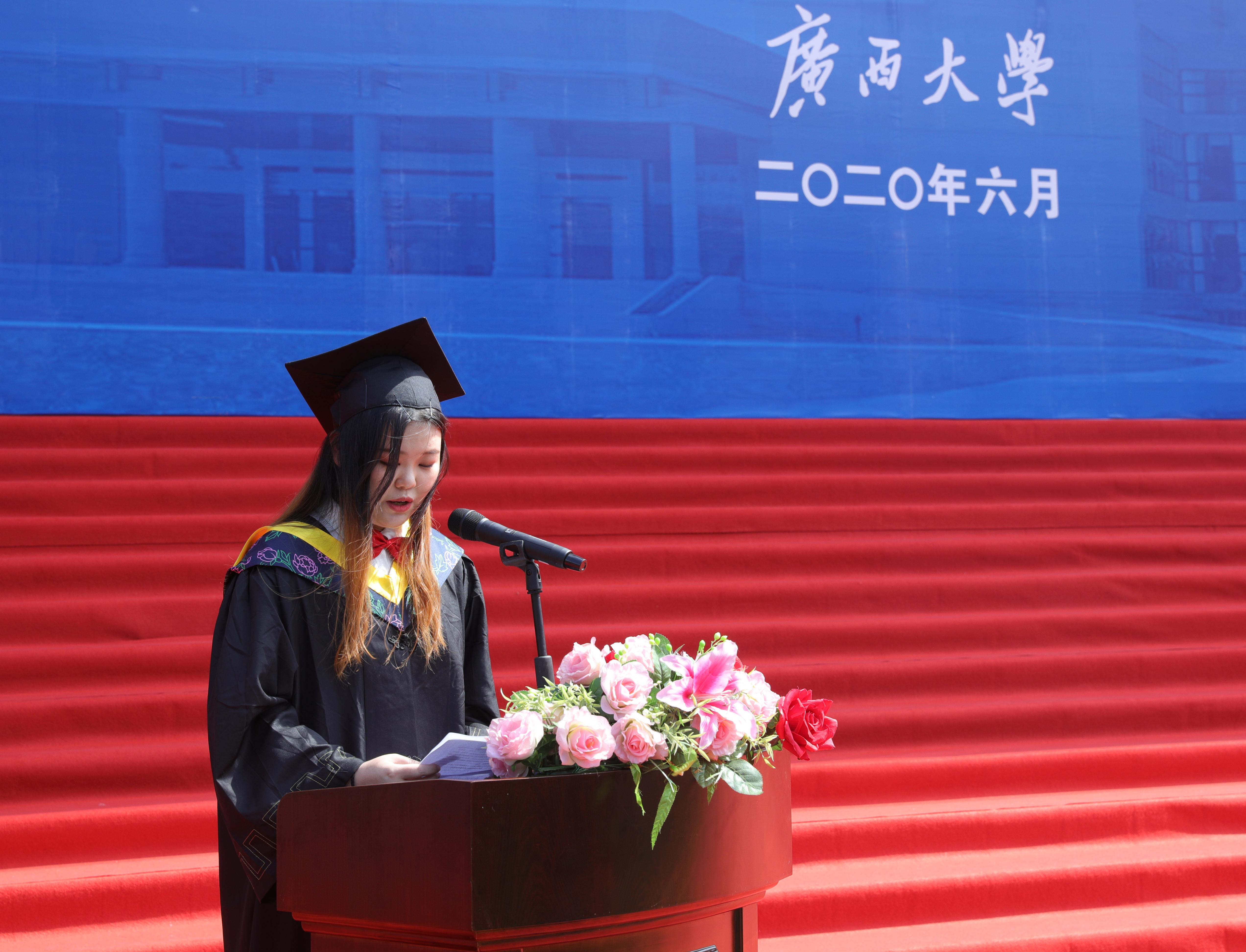 这场充满着清新气息的毕业典礼暨学位授予仪式,为严格疫情防控之下的毕业季增添了一份浓浓的惜别情绪,注定让我院学子们对校园生活留下独特的记忆,终生难忘。上午9时,典礼在庄严的国歌中拉开帷幕,院党委书记莫柏林对毕业生们表示祝贺,勉励同学们以抗疫一线的优秀校友为榜样,具有家国担当,勤学向善,砥砺前行,获得生活和事业上的成功;教师代表申佩弘教授感谢同学们在最美好的青春年华与老师们并肩作战度过了难忘时光,告诉毕业生,不论同学们将来遇到怎么样的难险阻或是灿烂辉煌,母校和老师永远是大家的支持与鼓励;家长代表陆美莲女士和毕业生代表李欣颖回顾了同学们求学中的点点滴滴,对学校、学院的培养和老师们的教导表达了感激之情,祝愿母校和学院发展越来越好,祝愿老师们工作顺利、阖家安康。最后,学院学位评定分委员会委员组成的导师团为毕业生拨穗、授予毕业证书和学位证书,仪式在老师、同学们共同唱响的《广西大学校歌》歌声中落下帷幕。