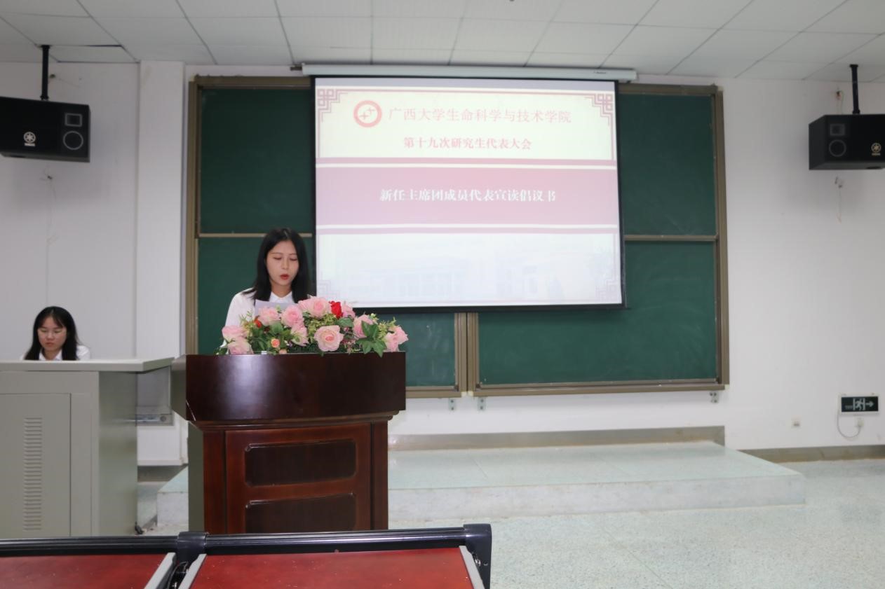 最后,新任主席团成员代表宣读倡议书,倡议全院学生要立大志,勇担时代使命;要树理想,坚定家国信念;要精专业,练就过硬本领。争做应用型、复合型生物人才,为我校建设特色鲜明的国内一流综合性研究型大学,实现中华民族伟大复兴的中国梦贡献青春和力量。