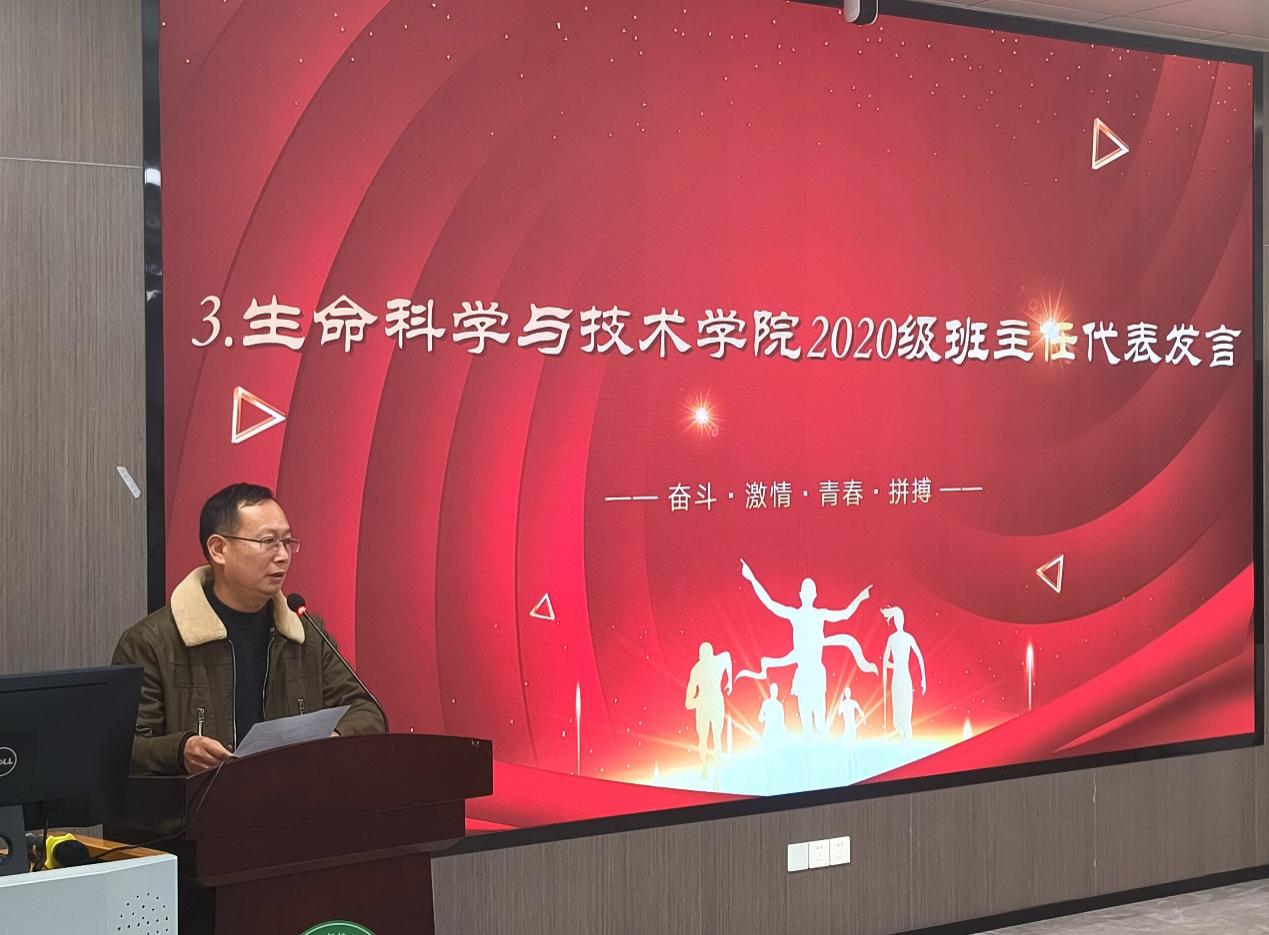 生命科学201班班长徐天峰作为学生代表发言,和大家分享了自己的考研心路历程。考研是一个长期积累并产出的过程,是一项大工程,他将不懈奋斗,坚持到底,刻苦学习,于千帆中乘风而起。