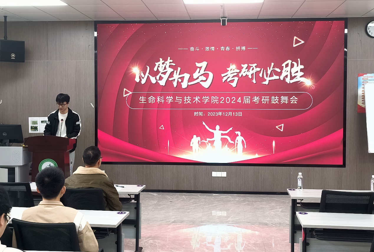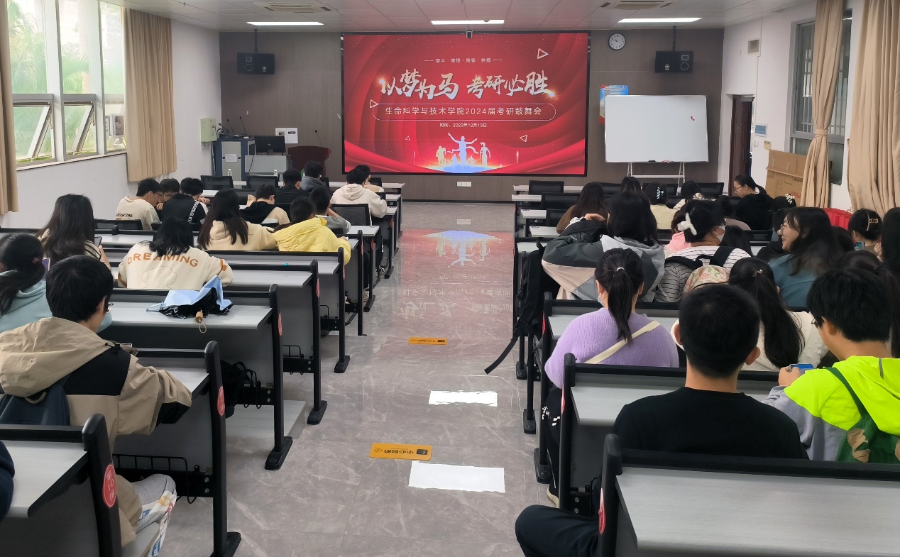 12月13日上午,我院在106教室召开2024届考研鼓舞会。学院党委书记黄开勇、副院长卢洁、生物科学201班班主任赵会敏、学工组辅导员及2020级全体考研学生参加本次交流会。会议由学院党委副书记覃文月主持。