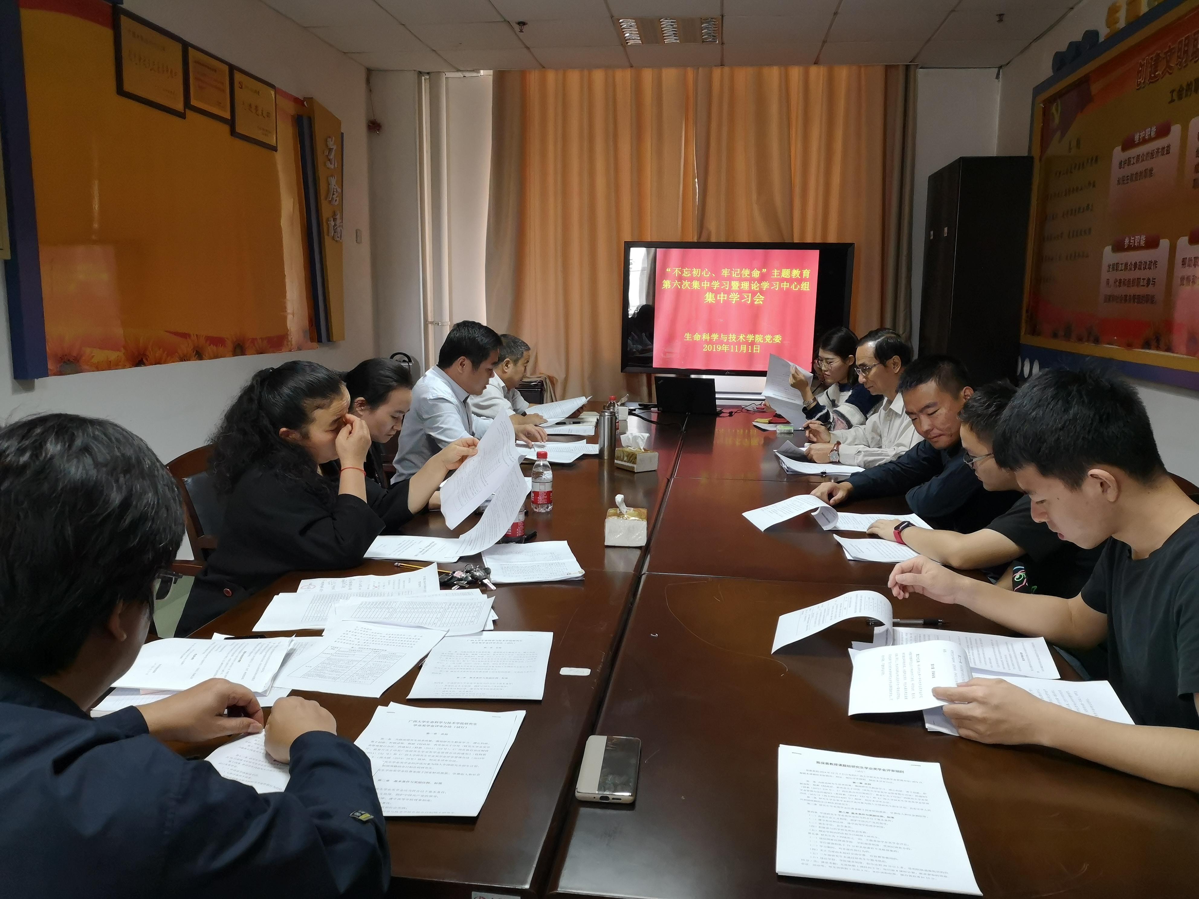 11月1日,我院召开“不忘初心、牢记使命”主题教育第六次集中学习暨院党委理论学习中心组(扩大)集中学习会,围绕“解放思想、敢作善成、为民服务解难题”的主题开展学习研讨。会议学习《习近平新时代中国特色社会主义思想学习纲要》《习近平关于“不忘初心、牢记使命”重要论述选编》和《中共广西大学委员会关于进一步解放思想改革创新扩大开放担当实干加快建设特色鲜明的国内一流综合性研究型大学的决定》,与会院领导围绕学习主题逐一进行了发言。