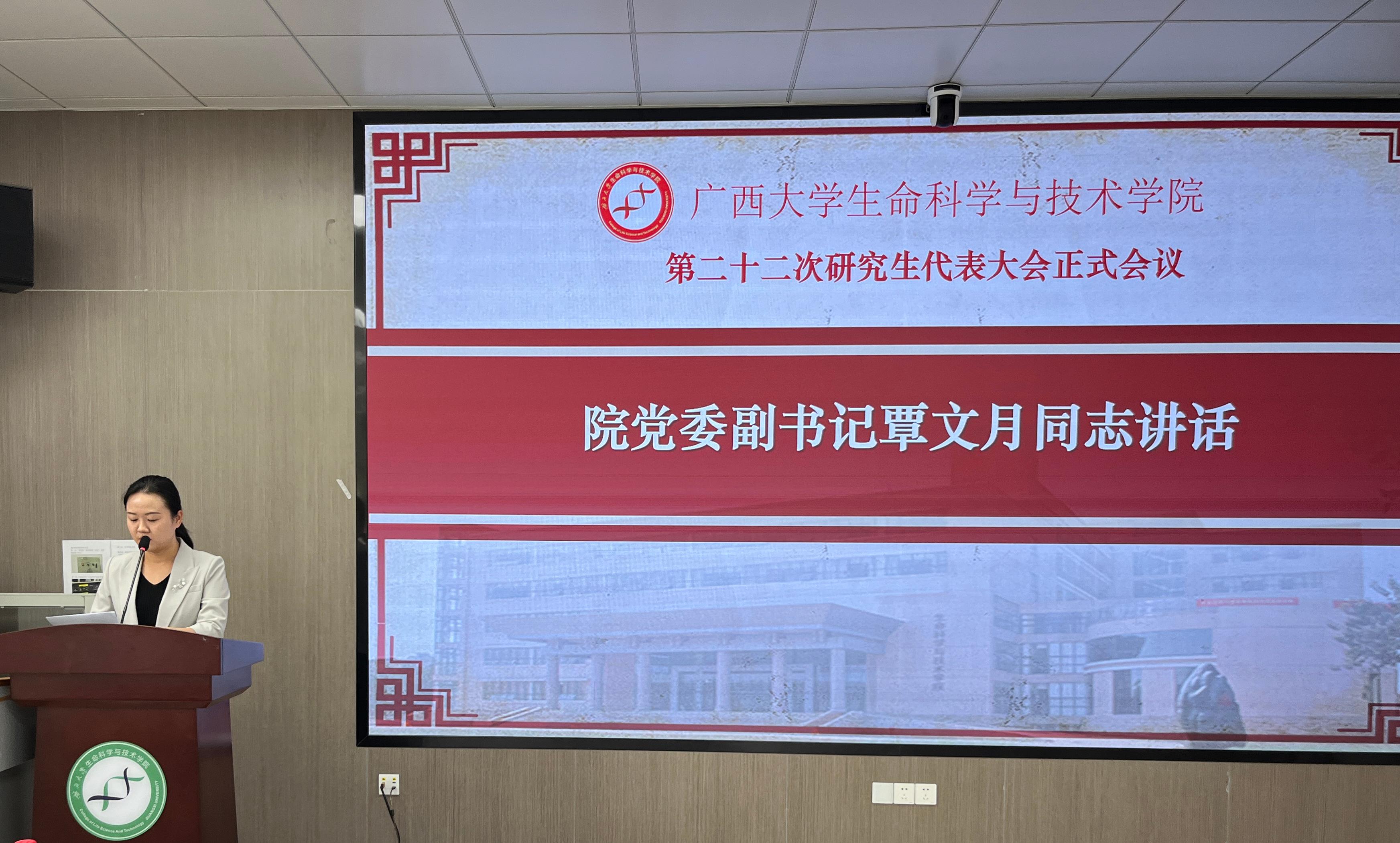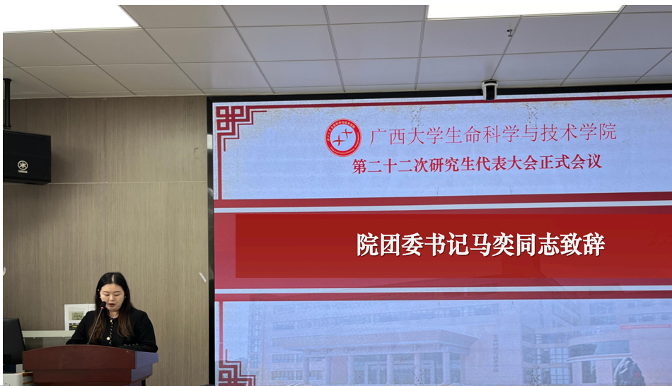 广西大学研究生会代表周奕彤同学致辞,她对本次大会的成功召开表示祝贺,对我院第二十一届研究生会在学术科研、文化、体育等方面开展的系列活动给予高度评价,鼓励新一届研究生会再接再厉,争创佳绩。