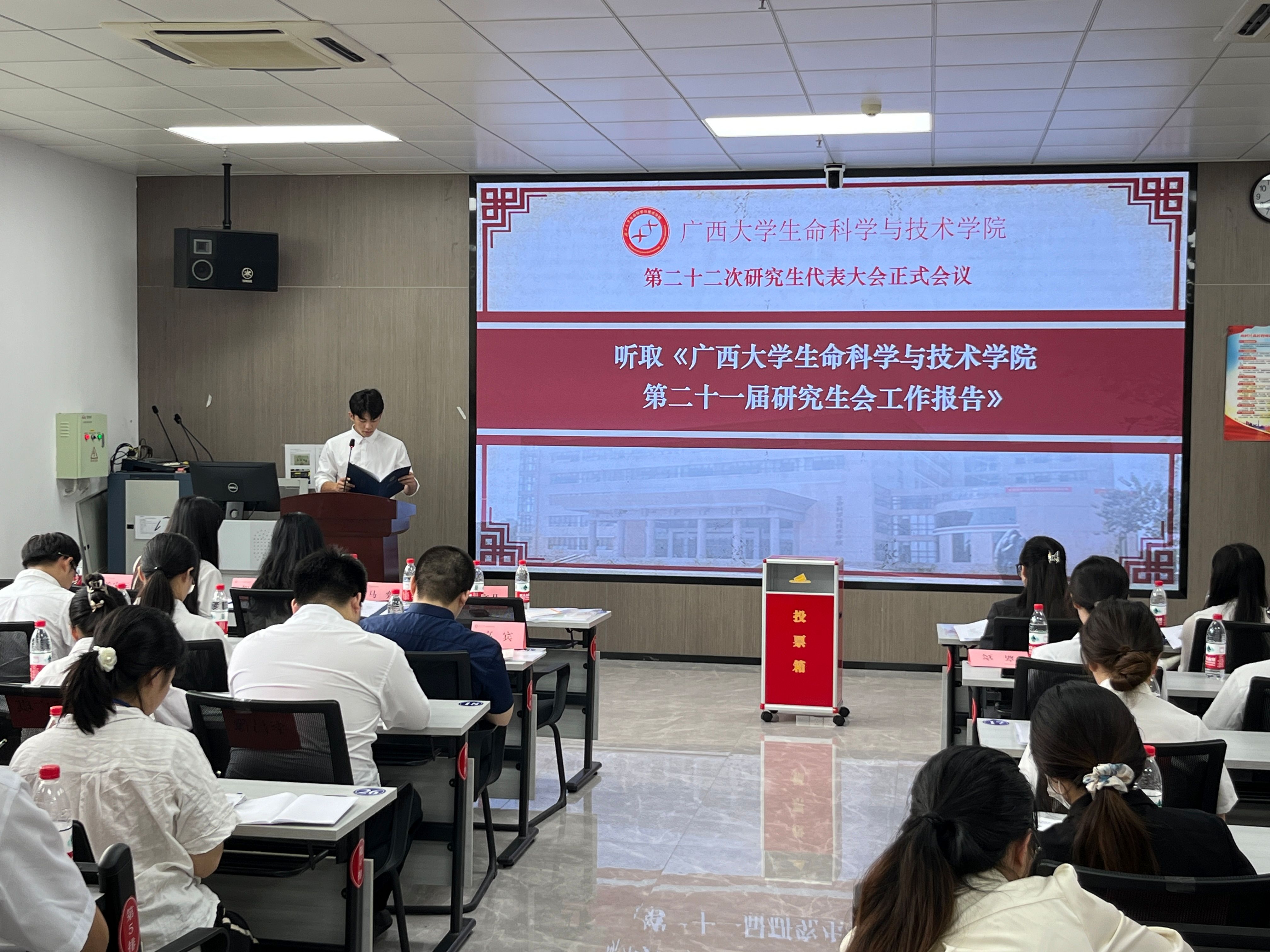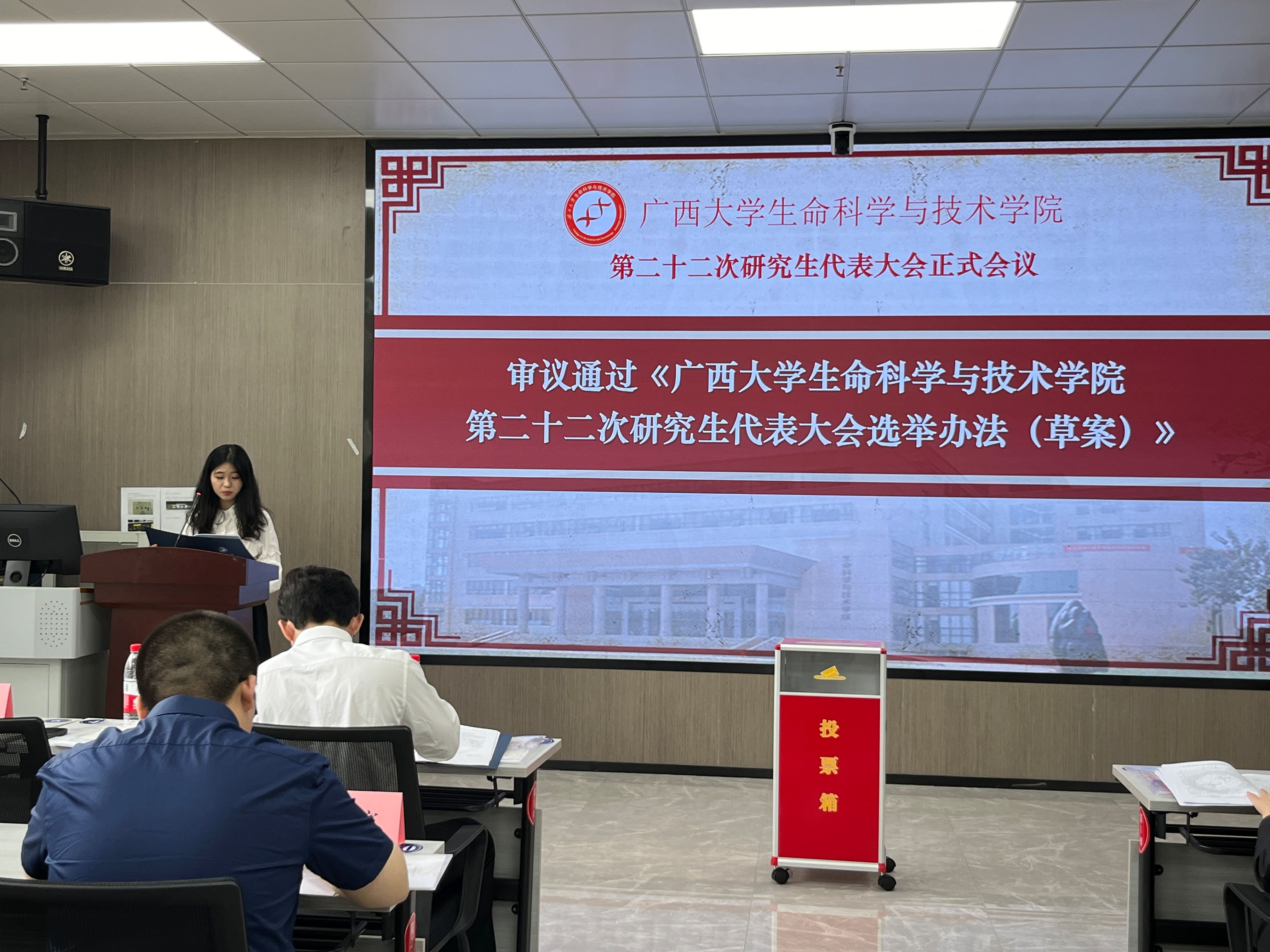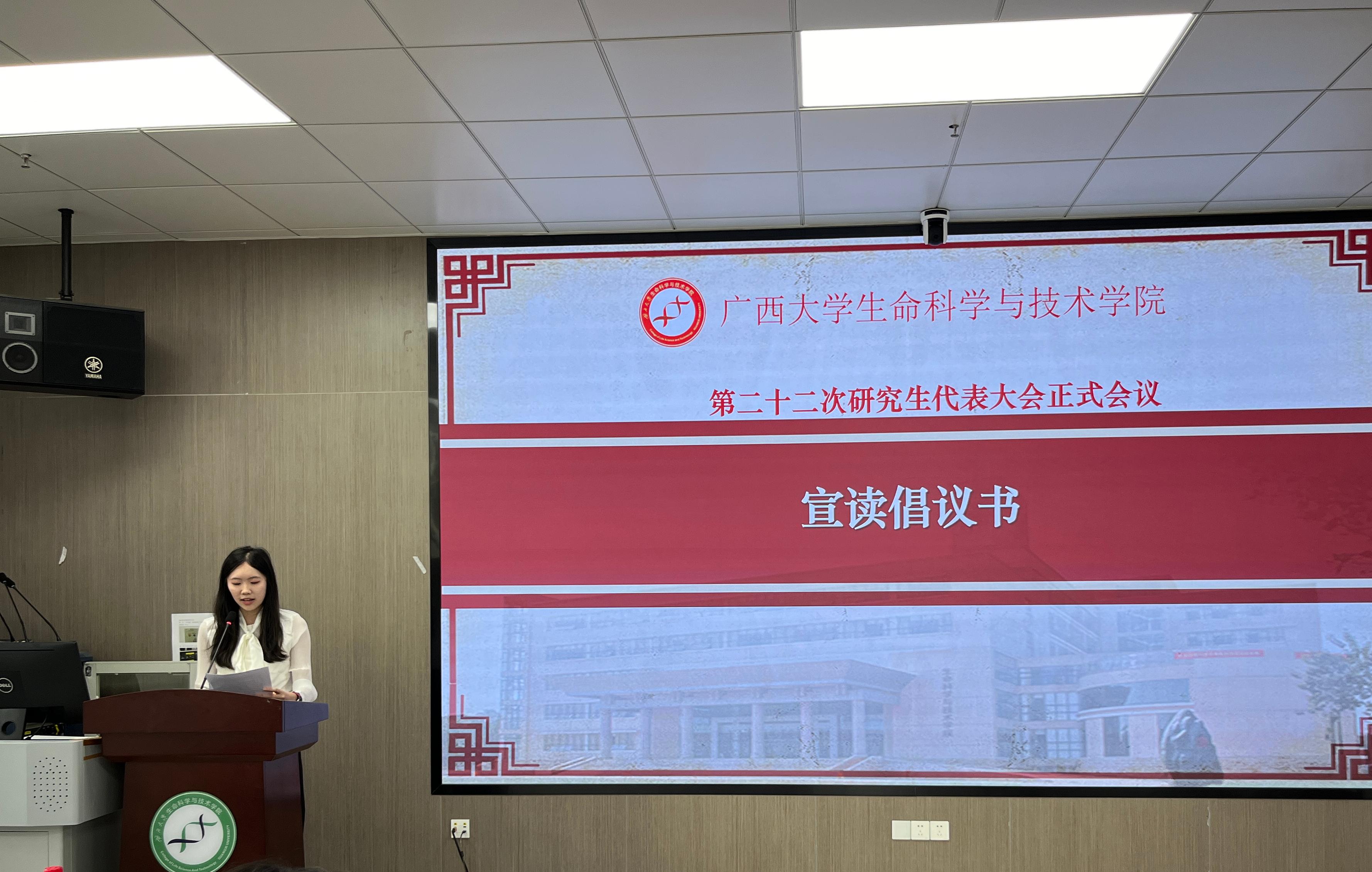 10月29日下午,我院第二十二次研究生代表大会正式会议在学院106室顺利召开。学院党委副书记、纪委书记覃文月,团委书记马奕,学工组辅导员贺超、关家运,广西大学研究生会代表,兄弟学院研究生会代表以及我院各班级代表出席本次大会。大会由学院第二十一届研究生会执行主席李晓玉主持。